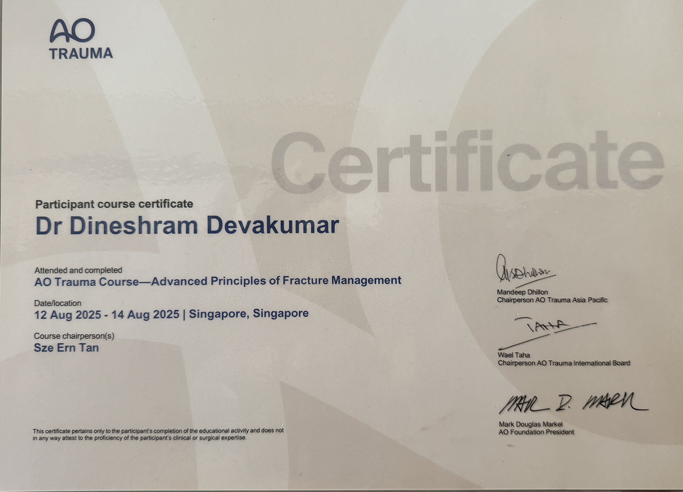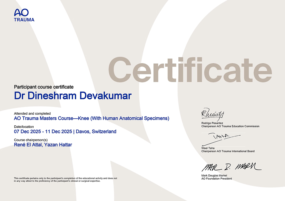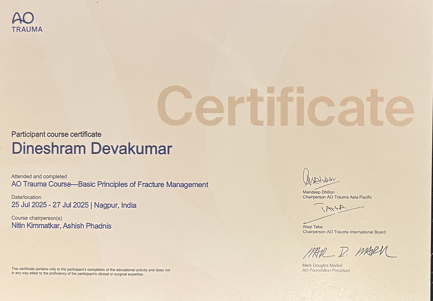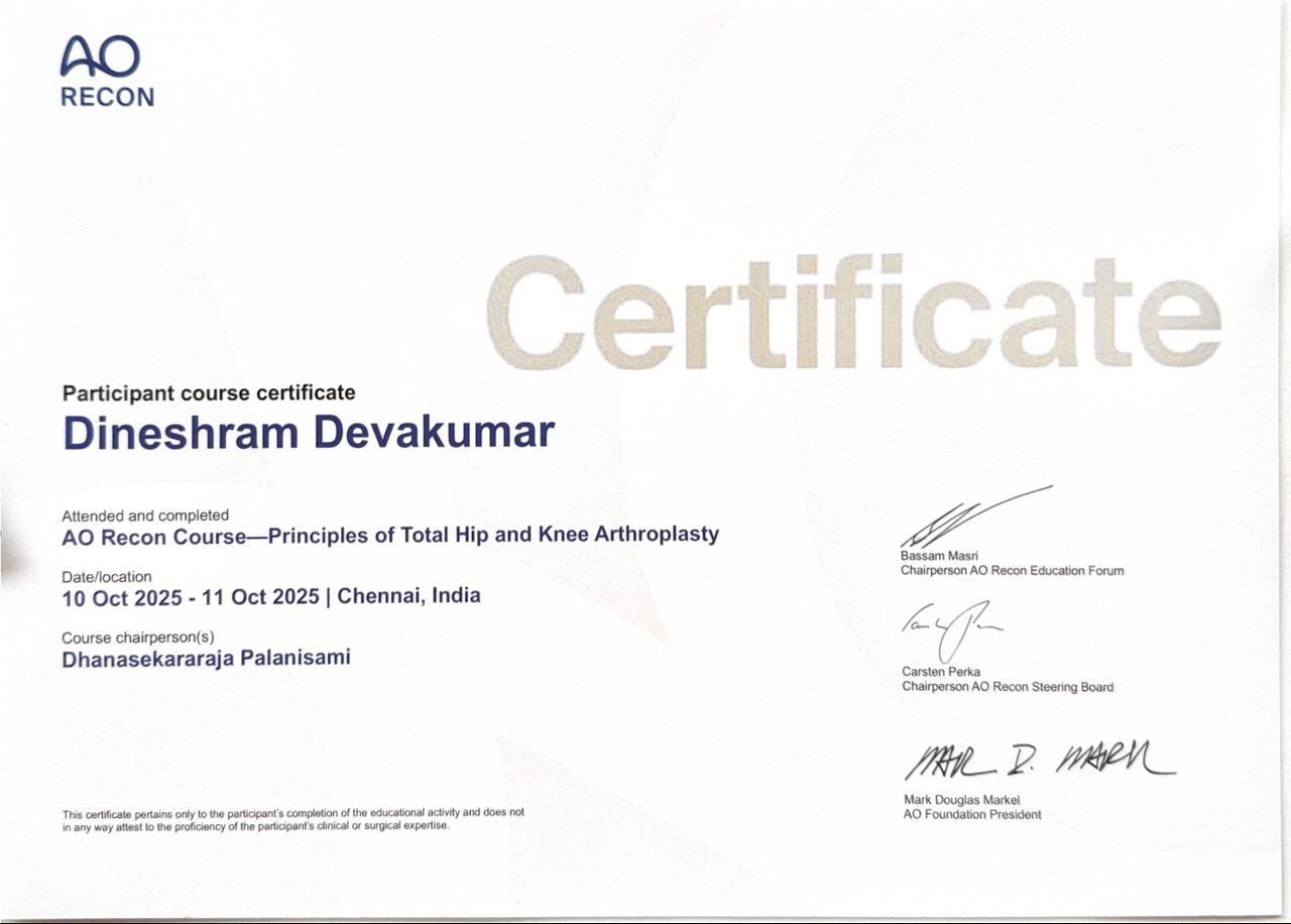 Hello, I’m Dr. Dinesh Ram, an Orthopaedic Surgeon committed to helping individuals regain mobility and live active, pain-free lives. With years of experience in orthopaedics, I have treated a wide range of conditions, from fractures, traumatic injuries to chronic joint disorders.